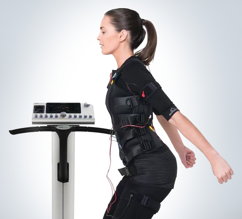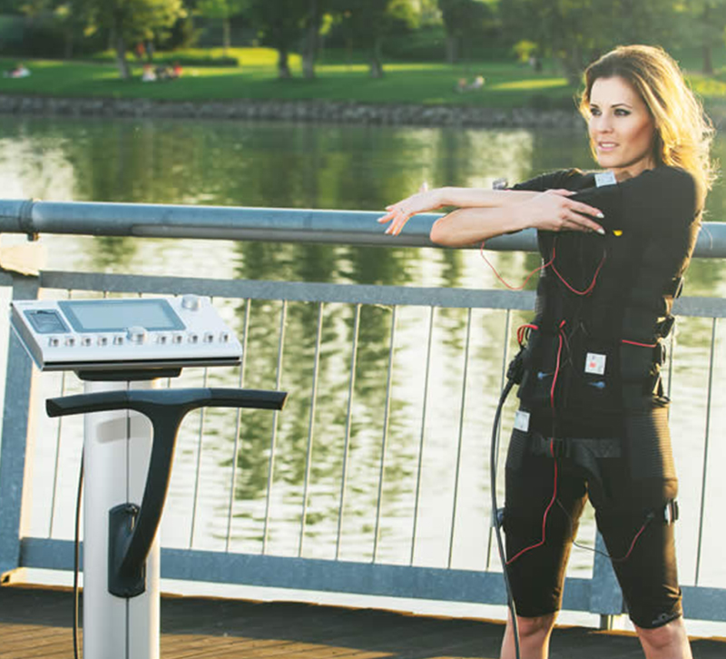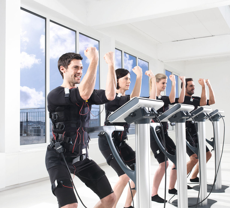 EMS stands for Electric Muscle Stimulation. Technically, EMS is a total body workout with body current. In this context, it might be helpful to know that our muscles contract through electric impulses (bioelectronics) in normal state. The EMS training makes use of this effect. By employing hardly noticeable external electro impulses, the natural effect is additionally intensified and an effective training can be achieved.